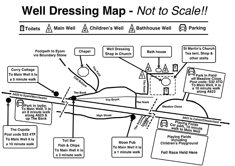 The Main Well is situated in The Nook, by Saint Martin’s Church, use post code S32 4TU. However for parking please see the map below, click here to download a PDF if you want to print it out.